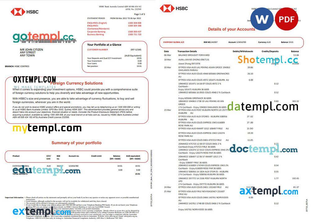 sample Australia HSBC bank statement template fully editable in Word and PDF format download