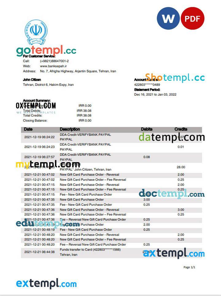 sample Iran Bank Sepah proof of address bank statement template in Word and PDF format download