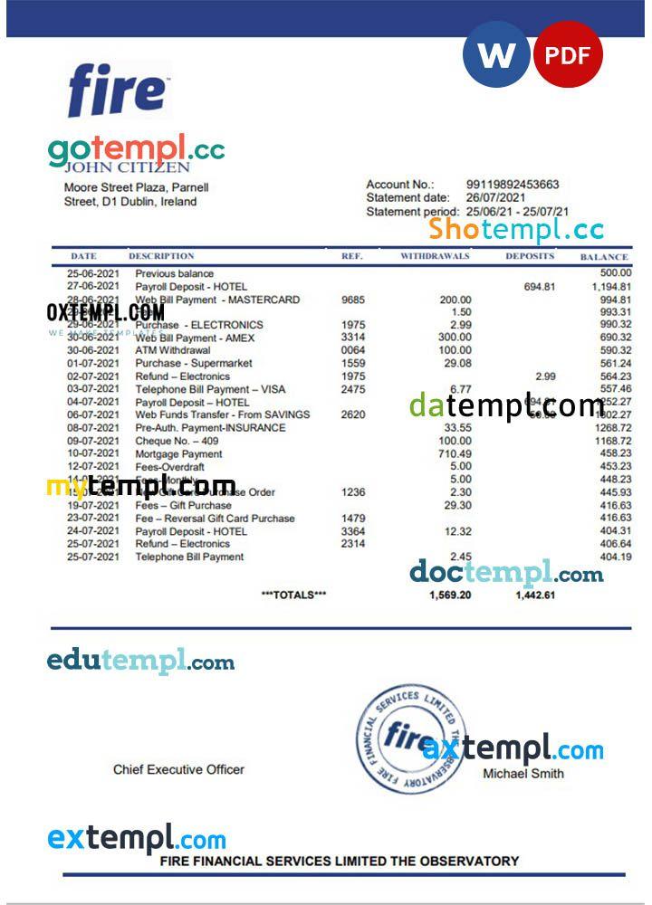 sample Ireland Fire Financial Services Limited account statement template in Word and PDF format dow