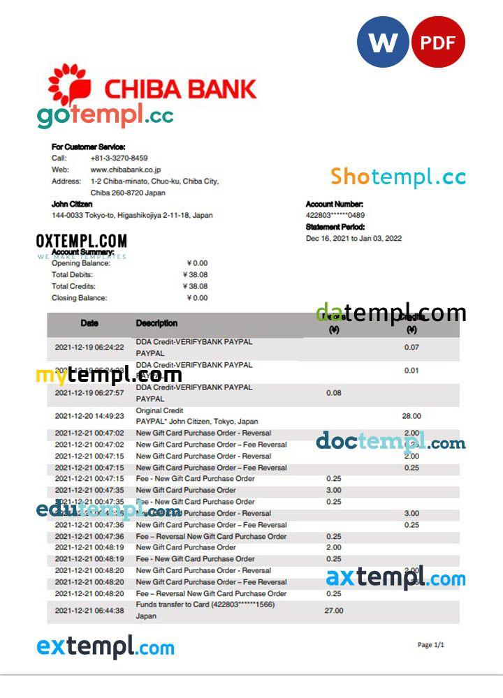 sample Japan Chiba bank statement template in Word and PDF format download