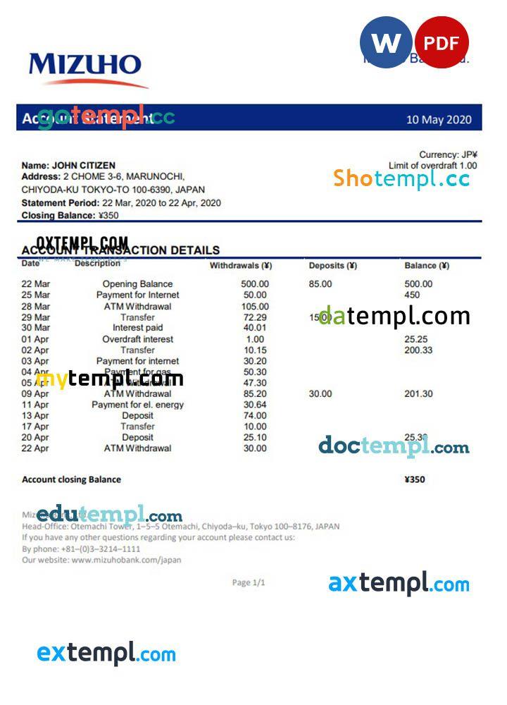sample Japan Mizuho Bank statement template in Word and PDF format, good for address prove download