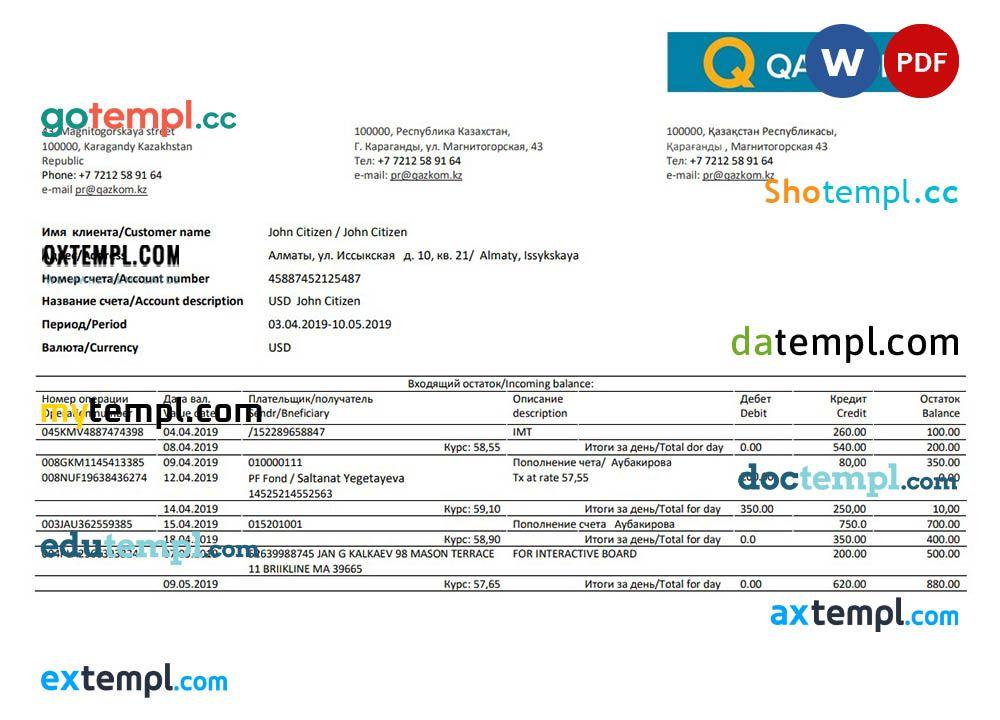 sample Kazakhstan Qazkom bank proof of address statement template in Word and PDF format download