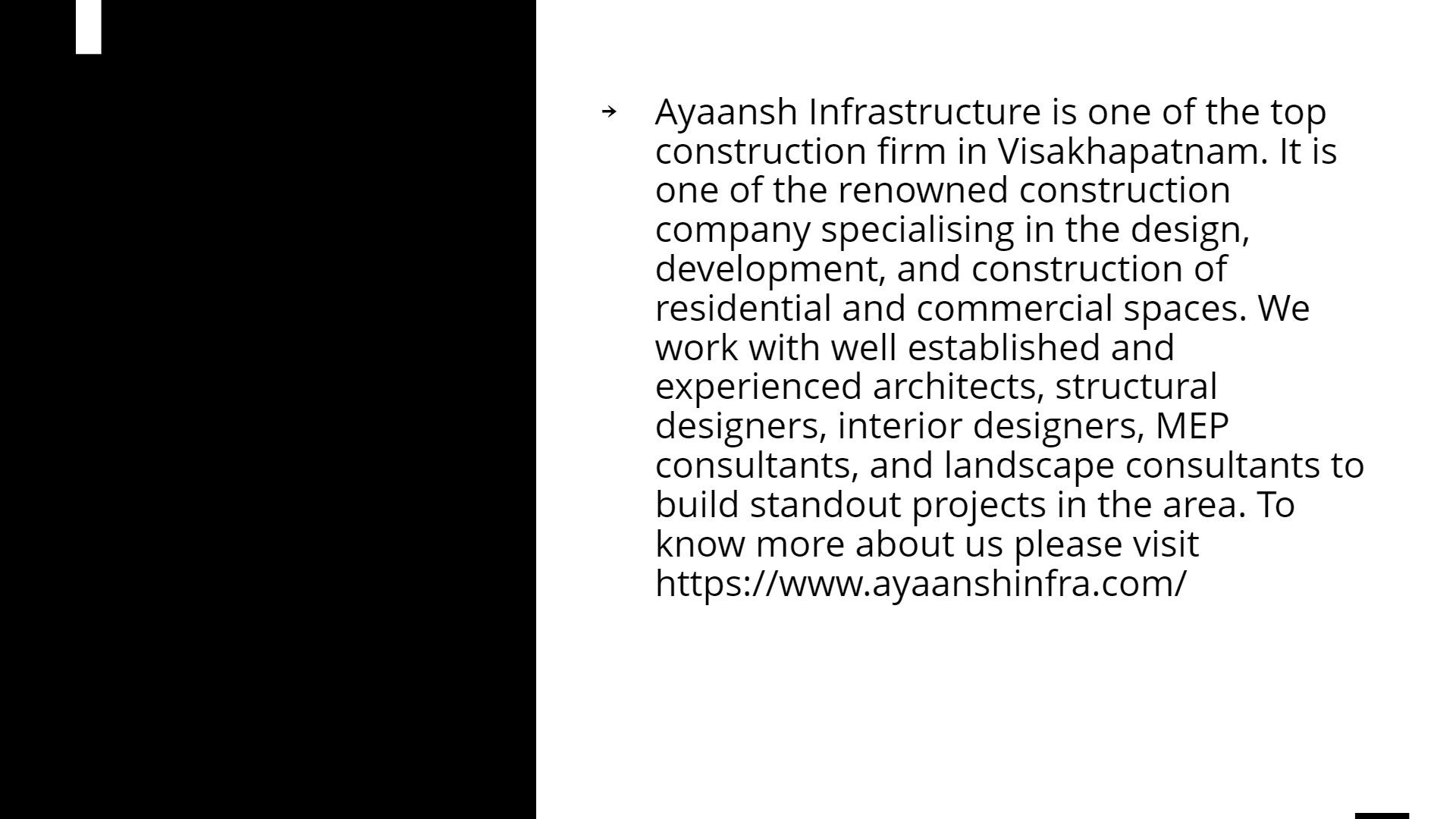 Ayaansh Infrastructure is one of the top construction firm in Visakhapatnam. It is one of the renowned construction company specialising in the design, development, and construction of residential and commercial spaces. We work with well established and experienced architects, structural designers, interior designers, MEP consultants, and landscape consultants to build standout projects in the area. To know more about us please visit https://www.ayaanshinfra.com/
