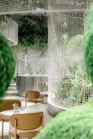 Custome design tables. Where nature is intelocked in the space and the tree in the middle of the table brings the outside in. Wooden ceiling element with Interlocked beams Conceret floor with pattern to create an intelocked look