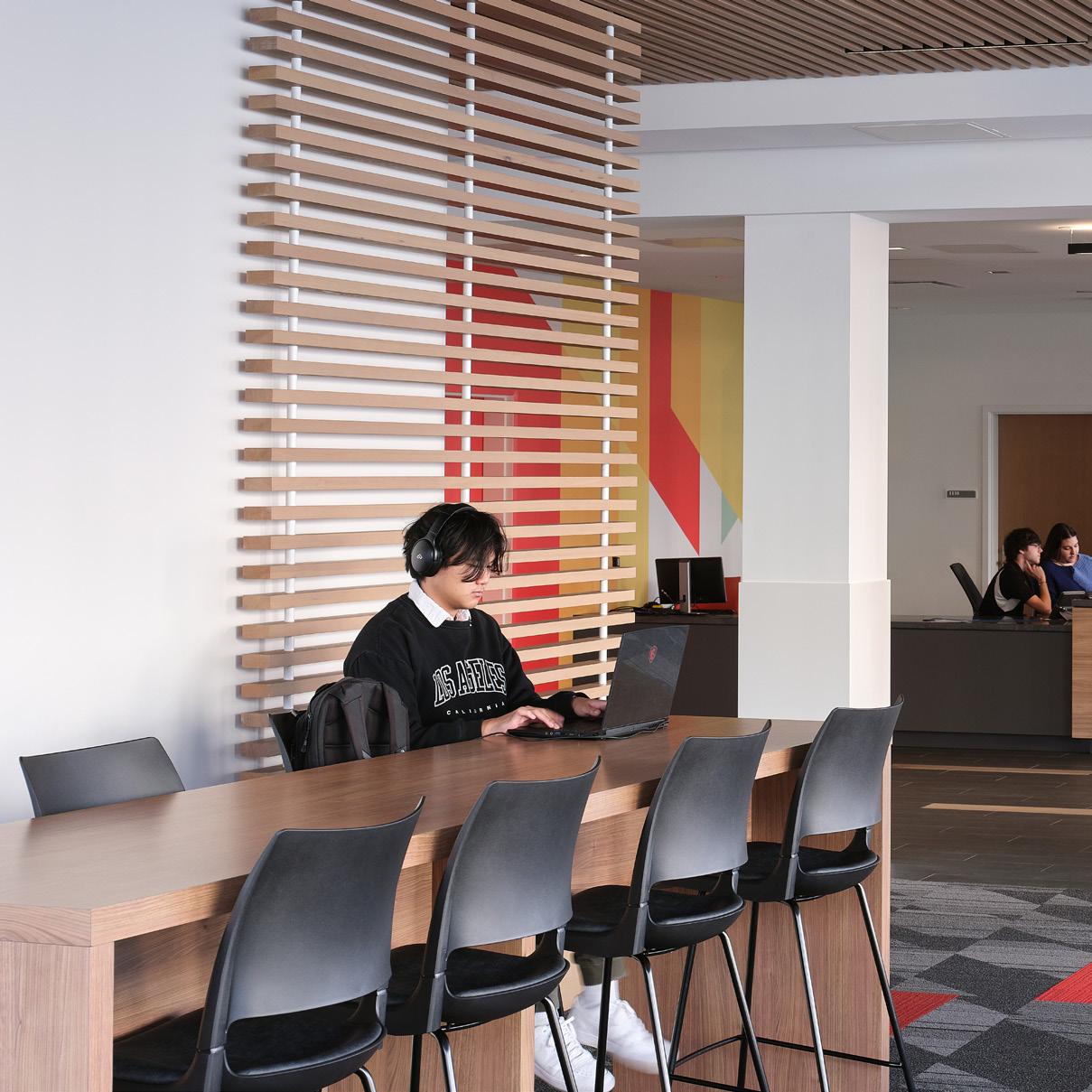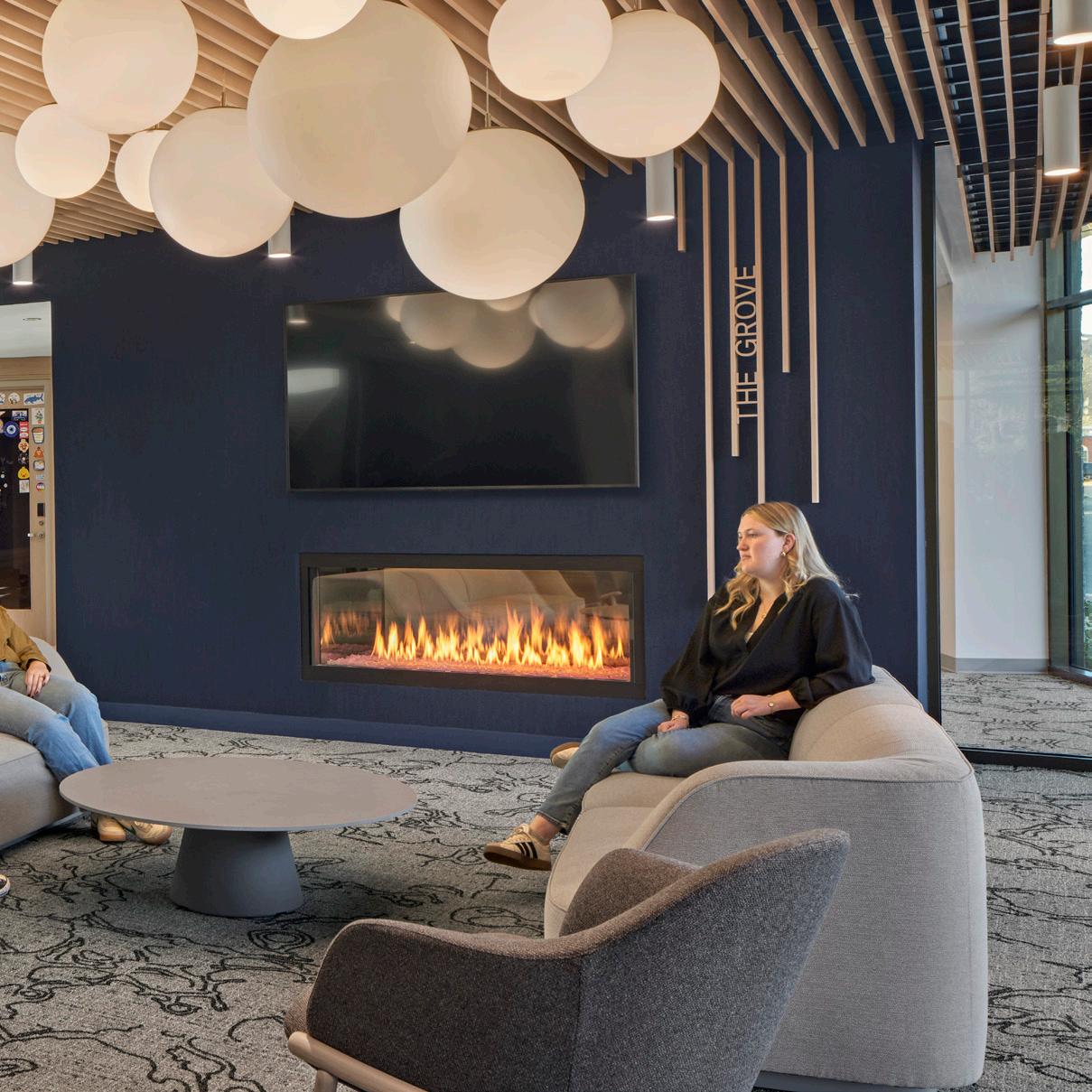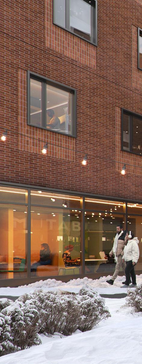 The strategic use of glass and well-positioned social spaces create a welcoming and intuitive residential experience. First-year students easily know where to go when leaving their units and can choose when and how to interact.