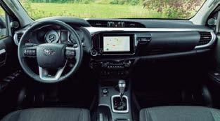 El funcionamiento del sistema 48V se puede clasificar en tres modos: CHG (recuperación de energía), PWR (potencia adicional) y ECO (optimización del consumo). La Hilux cuenta con llantas de aluminio de 18”, cuatro modos de conducción (ECO, NORM, SPORT, MTS), un sistema multimedia con pantalla de 8”, y compatibilidad con Apple Carplay y Android Auto. También incluye asientos calefactables, espejos retrovisores eléctricos, sensores de aparcamiento, climatizador automático y luces antiniebla LED. El Convertidor de Corriente Continua (DC-DC) integra el motor eléctrico con el sistema eléctrico del vehículo, mejorando la eficiencia de combustible en un 5% en comparación con la versión diésel sin aumentar las emisiones de CO2. La frenada regenerativa y el sistema Stop and Start renovado optimizan el consumo y ofrecen un arranque más silencioso.