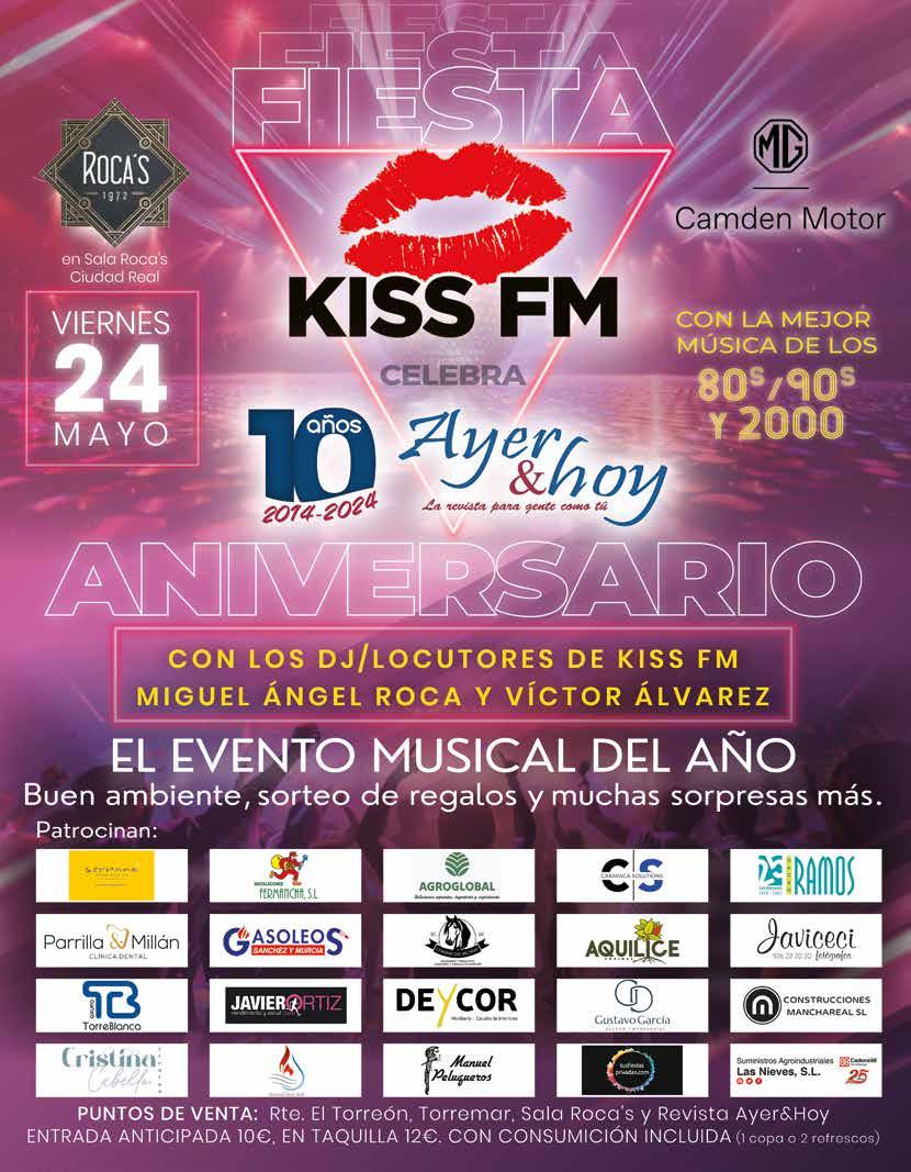 Por último, el próximo día 24 de mayo con motivo de nuestro 10º aniversario organizamos una sesión de música de los 80, 90 y 2000 de la mano de KISSFM en la Sala Roca´s de Ciudad Real. Un evento único donde locutores de Kiss nos acompañaran para ponernos la mejor música de estas décadas, amenizando una velada que promete ser especial.