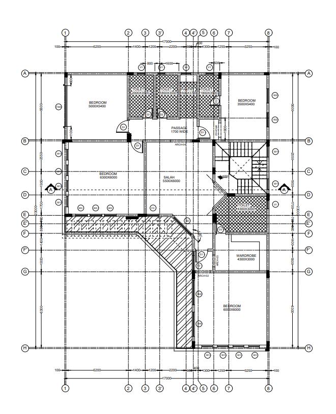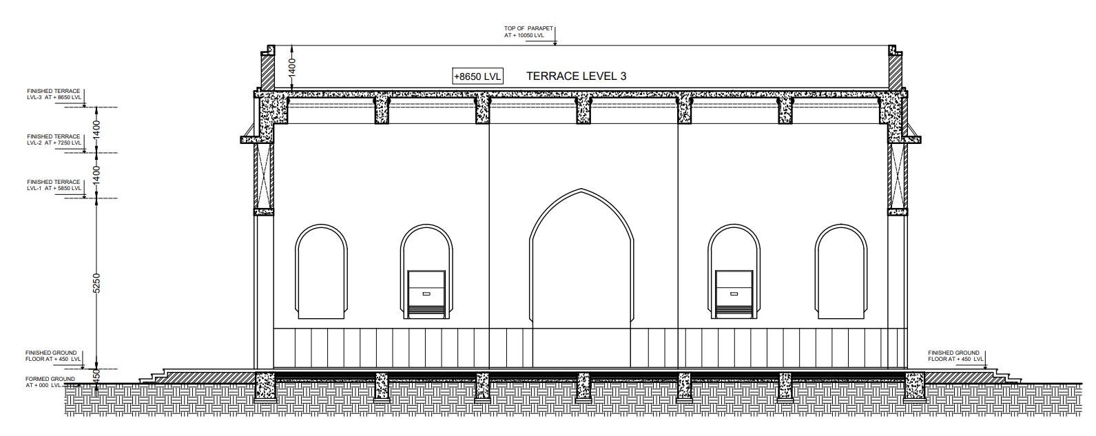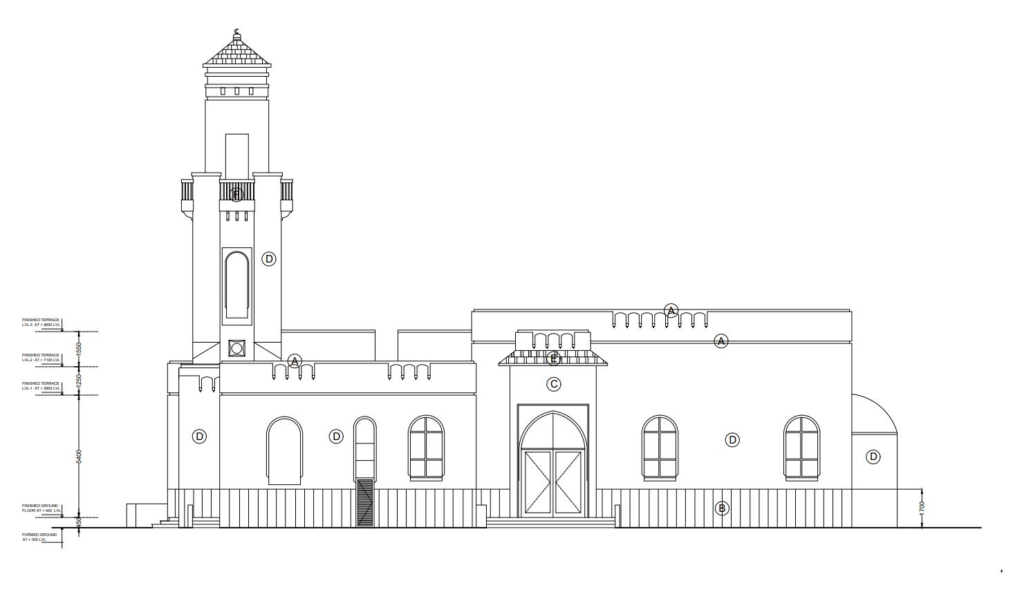 Project brief Mosque with the capacity of 364 persons, main prayers area 299.42 sq. ablution spaces, service rooms and staff living area with separate entrance. The main prayer hall accessed with three broad entrance. The mosque is characterized with Islamic design.