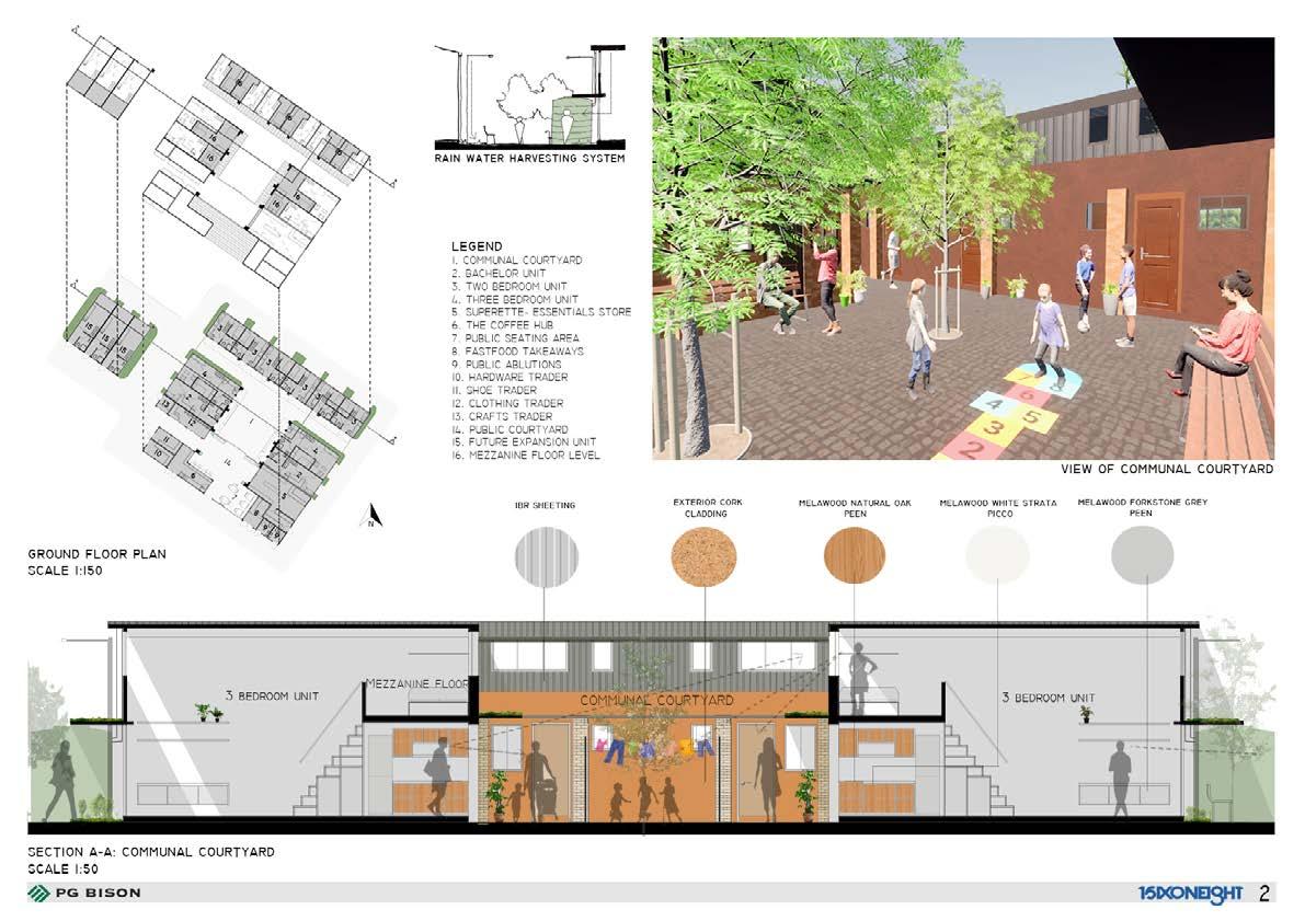Collaborative workspace Printing shop Pedestrian walkway Roof pitch level +7 700 Steel column level +6 700 Mezzanine floor level +3 000 Detail 3 0 000 Natural ground level (Concrete paving slabs finish) -1 300 Harrington Square 37x 725mm Galvinised steel with Chromadeck colour coated finish IBR metal roof sheeting bolted on Water proof vapor barrier on Rigid insulation board on 75x125mm CFLC steel purlins on 12mm plaster ceiling board 165x300mm exposed portal frame I-beam rafter 12mm plaster board interior wall vertical supported by 75x125mm CFLC sheeting rail bolted below 165x300mm steel portal frame I-beam rafter and 75x 125 CFLC studs at 600mm c/c 75X125mm CFLC sheeting rail flush joint supporting interior 12mm plasterboard wall and exterior 37x725mm IBR metal cladding facade Isotherm insulation placed between 75x125mm CFLC vertical sheeting rails 30mm polished screed flooring on 150mm concrete floor slab on DPM on 50mm Sand blinding on 150mm Compacted earth fill 150mm concrete floor slab constructed between 380x380mm concrete ground beam on stub column on pad foundation (depth specified by engineer) Flexi sealant between 75x125mm CFLC sheeting rails and 1500x2100 Aluminium frame glazed door 1 260 1 400 200 2 100 200 120 300 700 Flexi sealant between 75x125mm CFLC sheeting rails and 50x1 400mm Aluminum frame window 30mm concrete screed floor finish on 75x120mm Trapezoidal concrete floor bolted on 115x200mm steel I-beam bolted between 165x300mm steel portal frame I-beam columns 75X125mm CFLC sheeting rail flush joint supporting interior 12mm plasterboard wall and exterior 37x725mm IBR metal cladding facade Isotherm insulation placed between 75x125mm CFLC vertical sheeting rails 120x 180mm concealed box gutter on Waterproof vapor barrier on Rigid insulation board on 75x125mm CFLC steel purlins on 165x300mm exposed portal frame I-beam column Detail 2 Detail 1