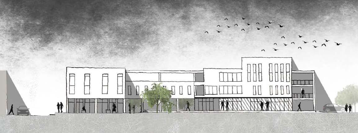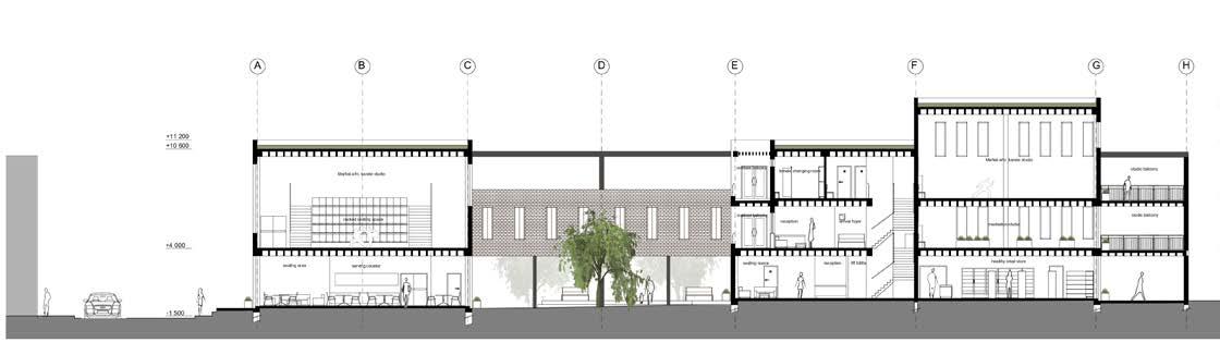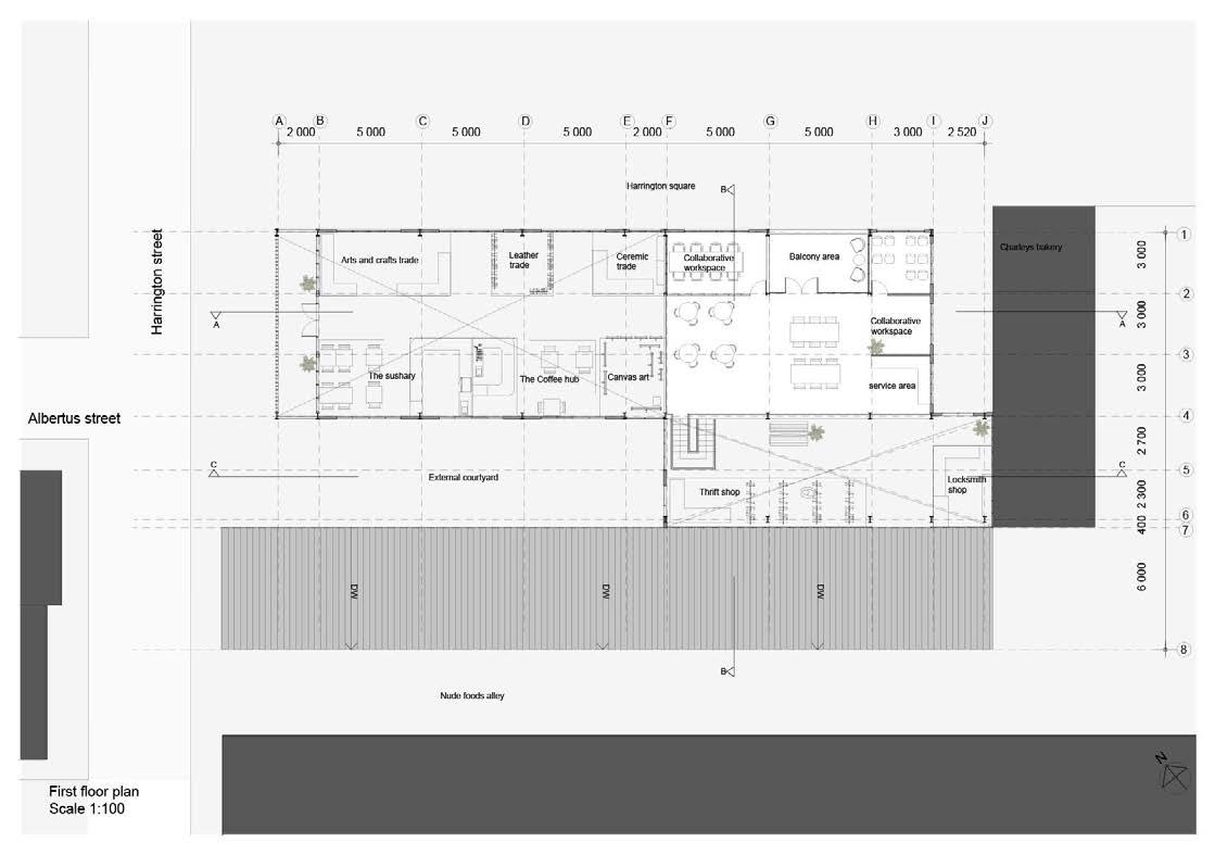 retail store storage room reception seating area male wc female wc disable wc cafe interior seating cafe exterior seating kitchen preparation room fire escape stairs lift lobby service room serving counter A B C D E G I J 1 2 3 4 5 Ground floor plan Scale 1:100 seating space 6 000 6 000 8 900 8 900 7 000 7 000 8 000 6 000 6 000 3 000 A A B B wc wc office cold storage staff kitchen arrival foyer Canterbury street Caledon street Harrington square N local traders square 6 000 6 000 6 000 H F North elevation Scale 1:100 -0 000 +3 500 TOC 1st floor level +6 800 TOC 2nd floor level +13 500 +4 000 TOC 1st floor -1 500 +10 600 TOC 3rd floor +11 200 A B C D E F I H J G 7 000 7 000 6 000 6 000 6 000 6 000 6 000 8 900 8 900 B B +12 900 TOC 3rd floor Drawing date: Drawing title: Scale: Project title: Institution: Course code: Student number: Name: Rev CAPE PENINSULA T4:CONCRETE REFERENCE 19/06/2022 General notes: Ground floor 300x300mm 110x50x110 Fire escape North elevation 00 01 02 22/05/22 30/05/22 16/06/22 19/06/22 03