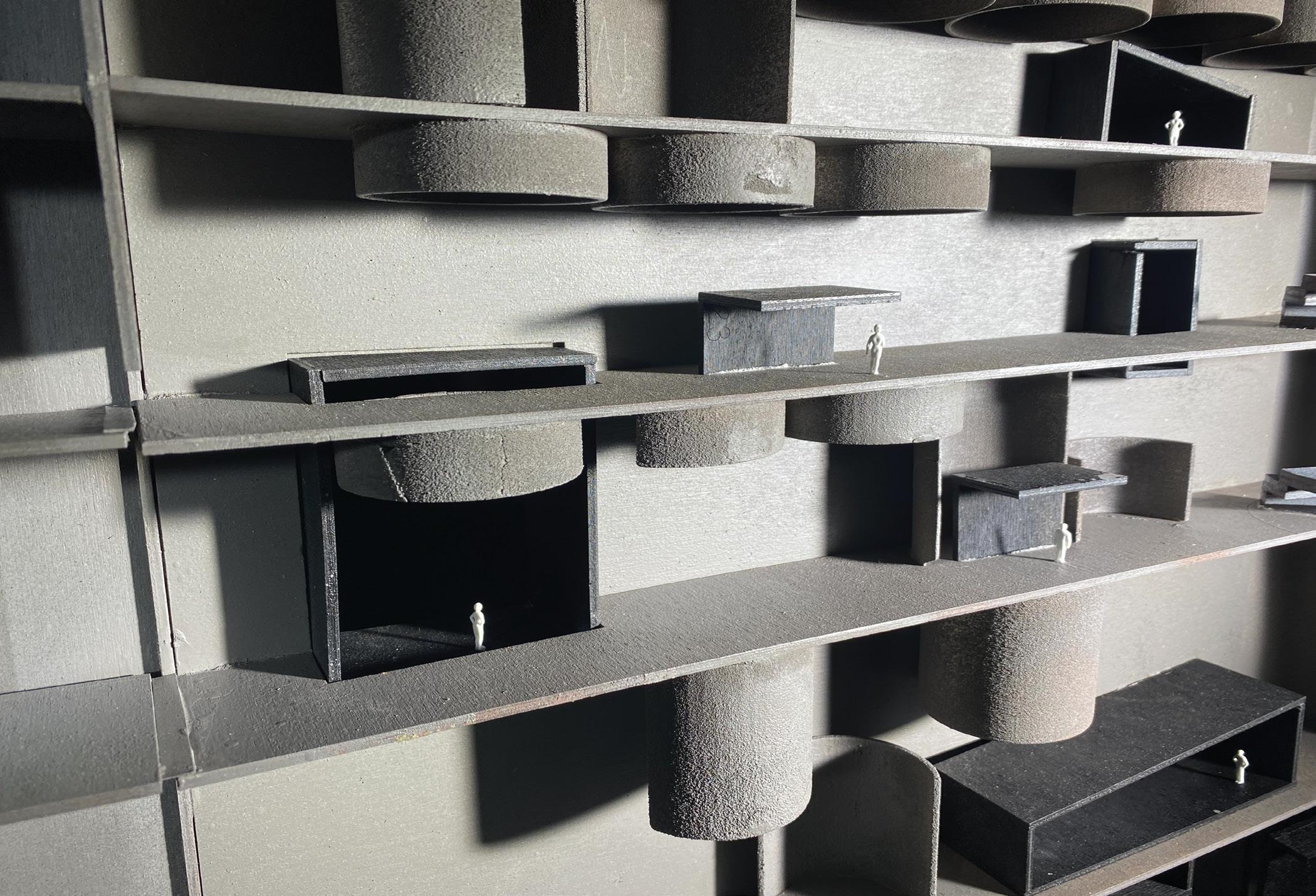 Rigid forms were utilized to carve out spaces within the silos, and we also explored how the silos could react and respond to these forms. A grid of rectilinear curves served as the foundational framework for these forms, which were extruded at various depths within the building, providing a framework for spatial relationships. The introduction of these forms caused the silos to react in intriguing ways, such as complete removal of certain sections of the silos, pushing upwards to hang from the ceiling, or pushing downwards to rise from the ground.