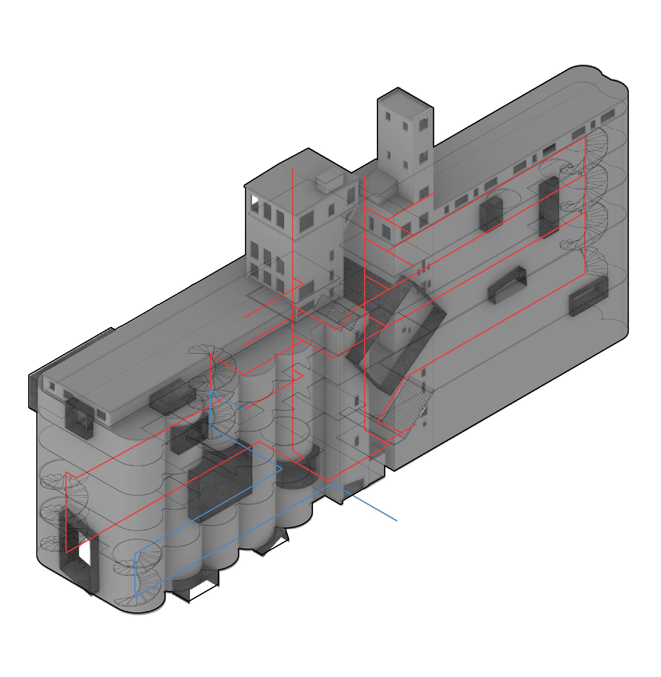 The building circulation is made through pathways within the silos at the corners of the building. The red path represents the pathway made available to everyone in the building while the blue path shows the pathway for private art exhibitions.