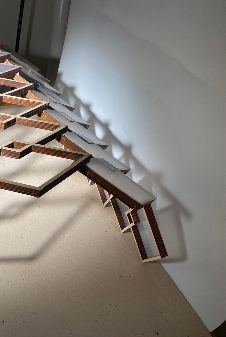 This physical model provided an avenue to explore the versatiloity of timber and plywood, as well as exploring lighting and shading conditions in reaction to the diamond frames