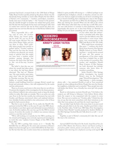 That list is now in new hands. To its credit, the Sheriff’s De partment invited the FBI in on the case. It’s up to the FBI’s discre tion whether to put their agents and substantial resources behind a case. As Gordon explains, this case was a go for the FBI for several reasons: It involves the murder of a child, it was extreme violence, and it is a case that can be solved.