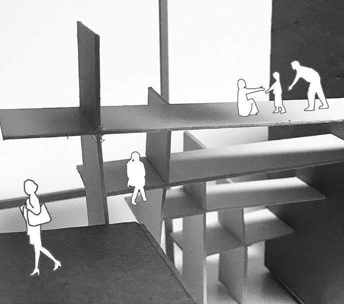 Taking close-up photos of spaces within the box model and adding figures allows for a better idea of scale and highlights the various architectural concepts. From this, a collage was made from lining up the photos to look like one continuous image. This will serve as the basis for the final outcome.