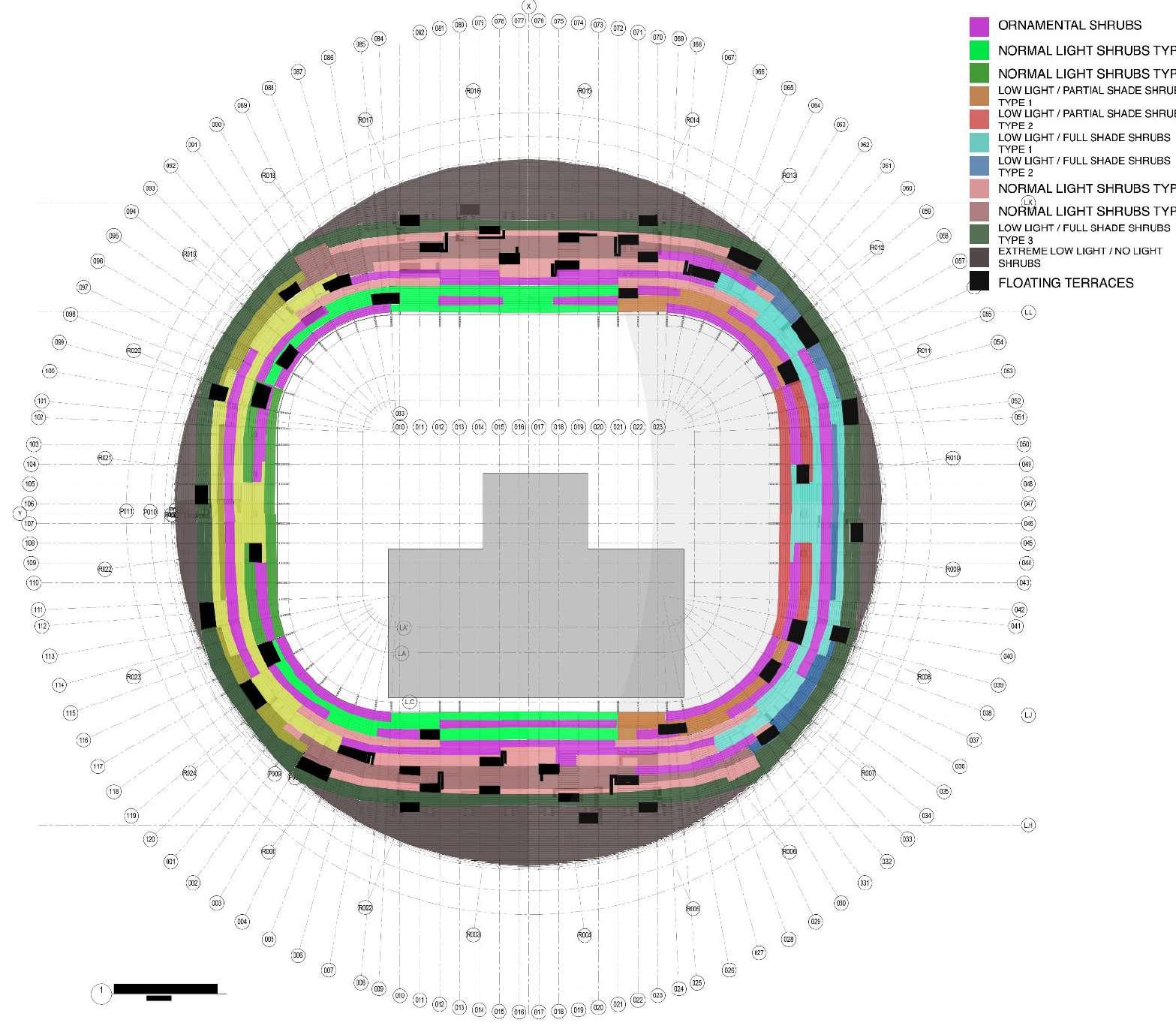 Planting has been proposed strategically considering the from structural design as well as availability of natural light due Solar analysis was carried out and the plants have been zoned based on sunlight requirement