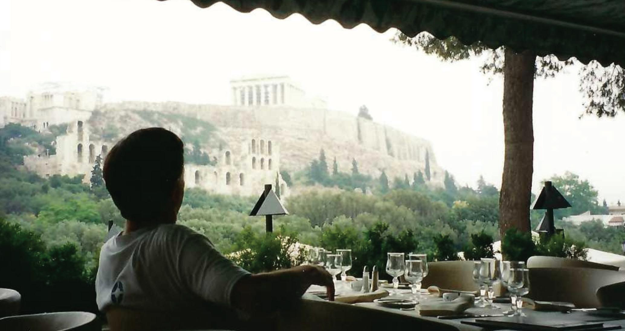 John Ridpath gazing at the Acropolis from the patio of an Athens restaurant in 1997. (Image courtesy Mike Berliner)
