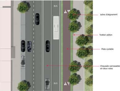 Cette proposition comporte une chaussée carrossable double voies, piste cyclable, trottoir piéton, et alignement d’arbres.