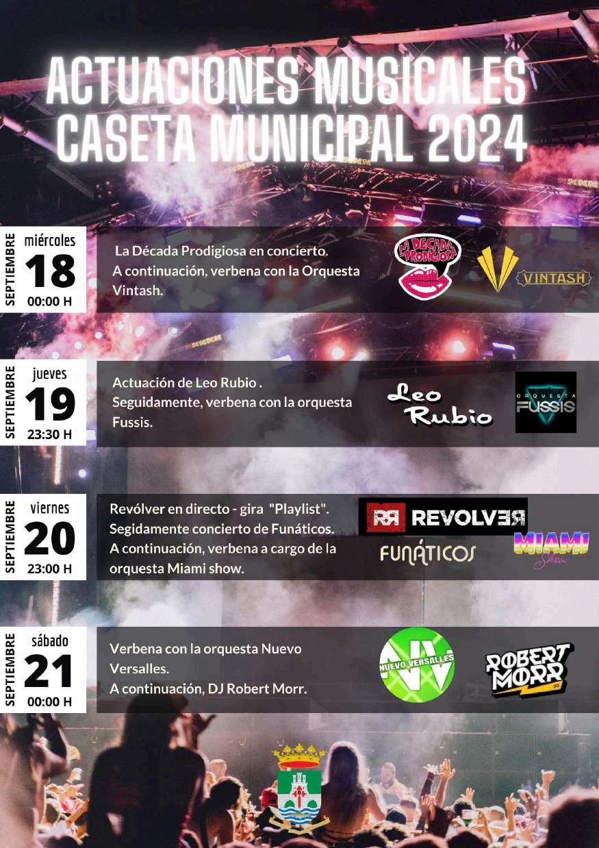 Extraordinario de “Las chicas de Oro”. Inmersos ya en los días festivos, además de los actos en honor a nuestra patrona, destacamos la apuesta por la calidad de las orquestas contratadas como Vintash, Fussis, Miami Show y Nuevo Versalles; la música en directo de la Década Prodigiosa, el mítico Grupo “Revólver”, Leo Rubio y los Creativos Funáticos; el musical infantil de La Granja Musical y el pasacalles “Universo”; la Zarzuela “El Barbero de Sevilla”; la actuación de DJ Robert Morr; los pasacalles musicales y la consolidada Concentración de Trajes de Flamenca. Asimismo, seguiremos reforzando la Feria del Ganado, pilar fundamental en el origen de nuestros días festivos, y la Muestra de Trabajos Tradicionales sumando una Exposición de Maquinaria Agrícola y la demostración del arte de tallar con motosierra, sin quitar protagonismo al espectacular Festival del Arte EcuestrequepodremosdisfrutarenlaPistaEcuestreMunicipal.