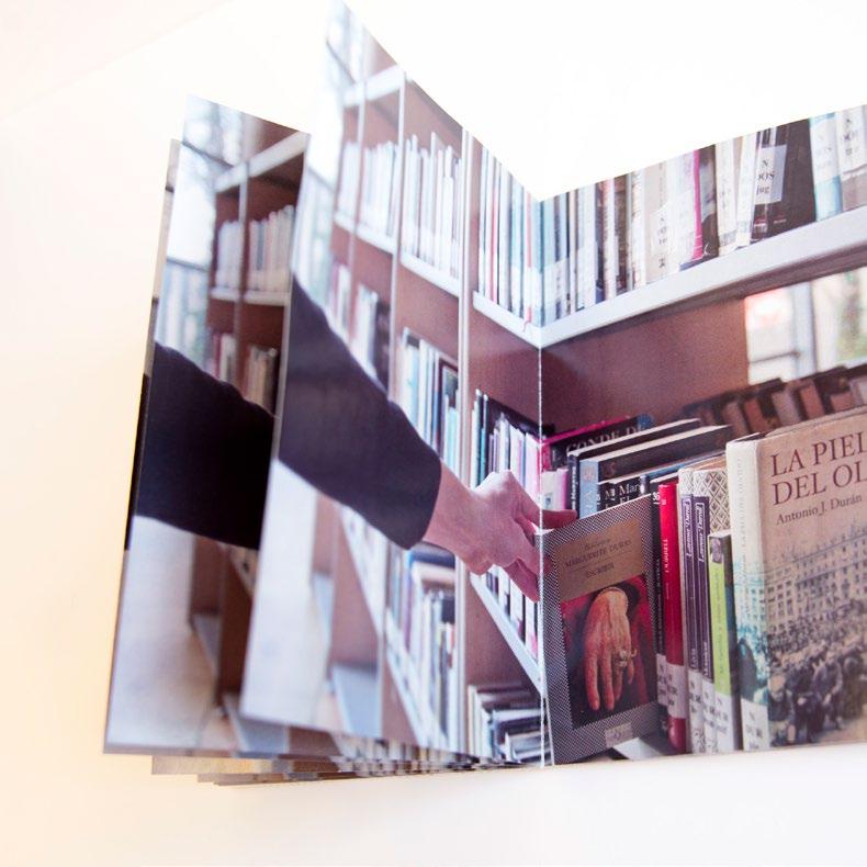 En las estanterías de la Biblioteca Municipal de Ana María Matute, no encontré Escribir de Marguerite Duras. Decidí intervenir este libro generando una acción casi inadvertida, pero al mismo tiempo relevante. Introduciría mi ejemplar de Marguerite, de uso personal, en el estante correspondiente de la biblioteca pública. Documentaría la acción con fotografías, y retornaría ese mismo libro sin el texto, pero con las imágenes del propio acto en la biblioteca Ana María Matute.