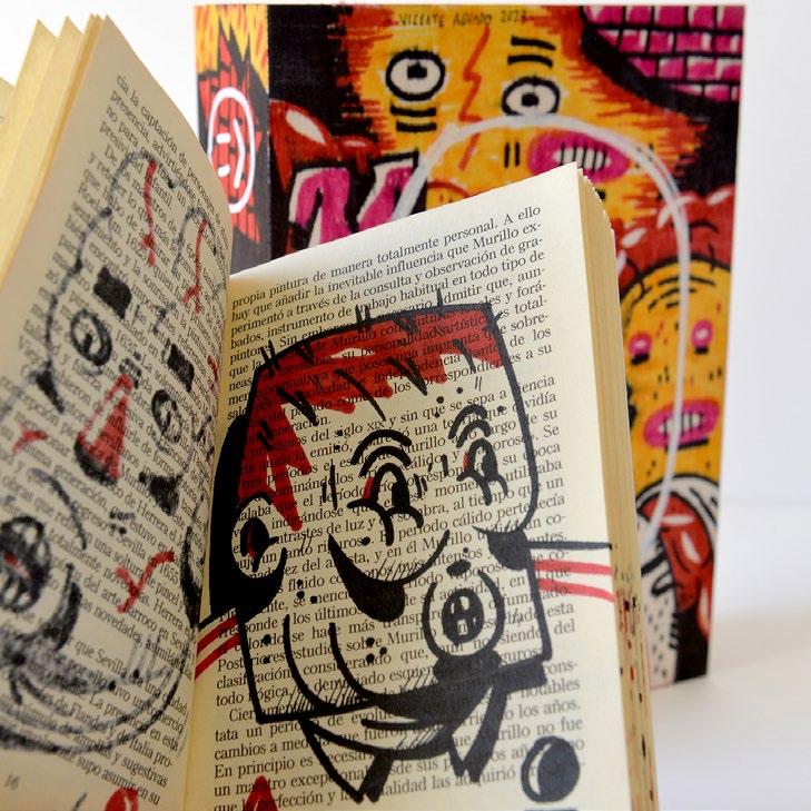 Cuando Mercedes Prado me invitó a intervenir un libro, pensé trabajar en alguno de mis libros de cabecera y crear un proyecto más conceptual, pero al rato me acordé que otra de las cosas que más me gustaba hacer con los libros de joven (principalmente con los de texto del cole), era garabatearlos con animales prehistóricos o personajes de los comic de la época, incluso me atreví a pegar algún animal sacado de un álbum de cromos, al lado de la catedral de Burgos y así crear una nueva historia paralela.