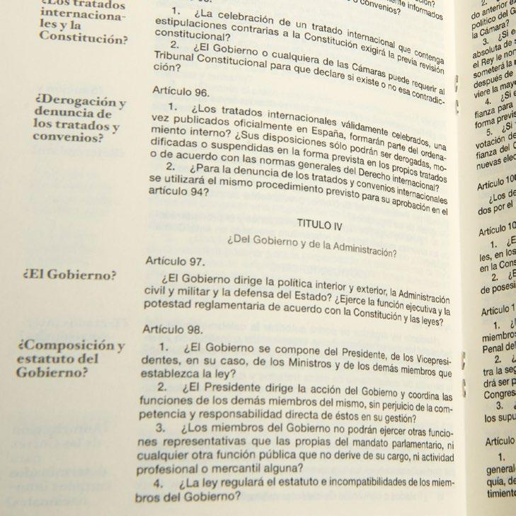 Una edición intervenida de la Constitución Española a la que se han añadido signos de interrogación a cada una de las frases del texto.