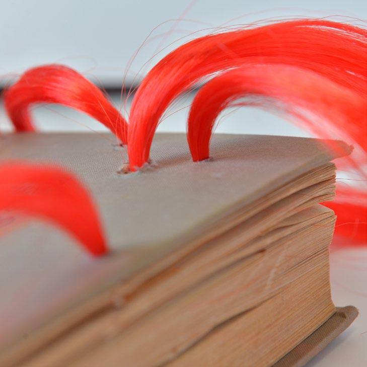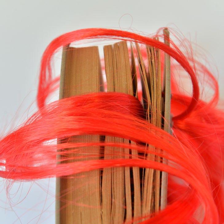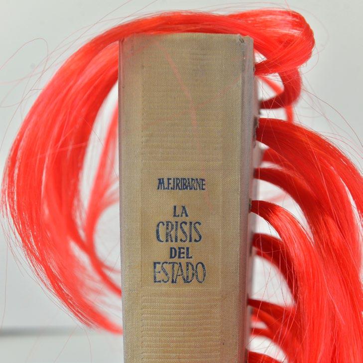 Cuando fui invitada a participar en este proyecto apareció en mi cabeza la imagen de lo que quería hacer: un libro al que le nacen mechones de pelo de color artificial. Después de esto, solo faltaba encontrar el libro apropiado para que esta intervención tuviera sentido. Y apareció La Crisis del Estado de Manuel Fraga Iribarne, en una edición de 1958, en plena dictadura franquista.