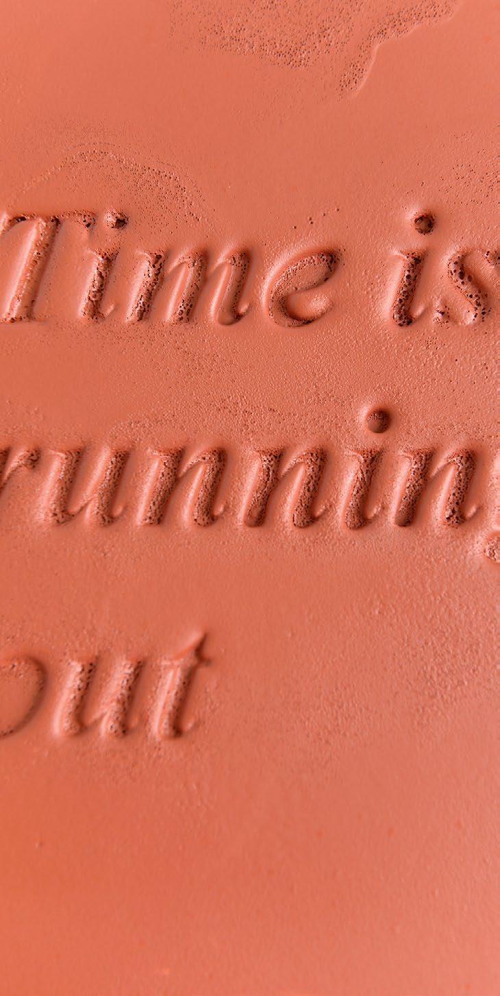 Hay un ejercicio aquí de transformar la reclamación joven en Arte, la palabra en escultura. Pero, además, hay lemas que podrían intercambiarse con otras reclamaciones, hay frases que representan ideas, que son las puntas de esos icebergs que también van a ser importantes en el futuro, los libros que narrarán el futuro, los que se escribirán por las próximas generaciones que tienen claro que hay que preservar el planeta y que el futuro pasará por ahí o no habrá futuro, la sostenibilidad como algo clave en lo que esta por venir. El degradado de colores, esos naranjas que representan el atardecer pero también un amanecer, el de la esperanza en los jóvenes y sus capacidades.