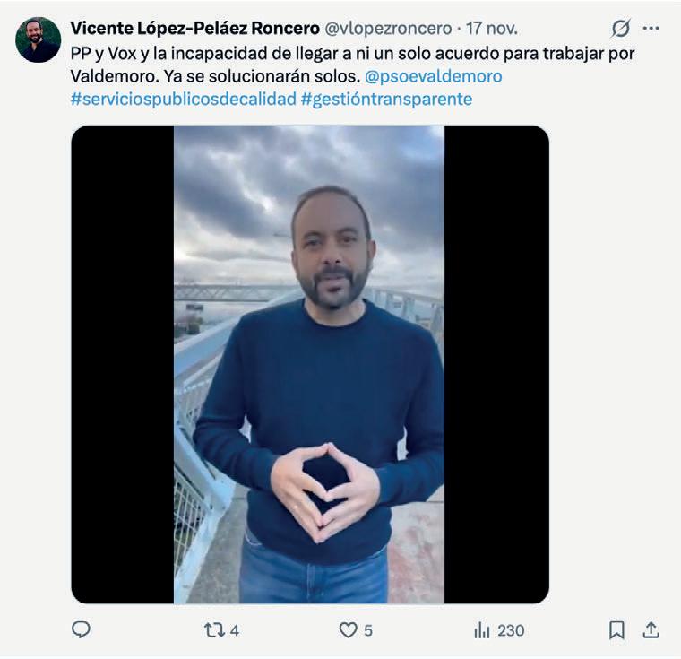 Ábalos y Koldo ingresan en prisión por riesgo extremo de fuga, mientras Sánchez sigue aferrado al poder pese a sus mentiras y al apoyo de sus socios y del aparato mediático. Exigimos su dimisión inmediata y que responda ante la Justicia. Ha llegado el momento de presentar una moción de censura para que todos se retraten y quede claro quién sostiene a este gobierno agotado. La derrota en la senda de estabilidad confirma una legislatura sin rumbo, dirigida por un Ejecutivo que solo genera corrupción y perjuicio para los españoles, por lo que VOX mantendrá una oposición total para sacarlos del poder cuanto antes. En la Comunidad Valenciana apoyamos la investidura sin pactos, exigiendo compromisos: control de inmigración ilegal, devolución de menas, seguridad y defensa del campo frente al Pacto Verde. Mientras tanto, en Valdemoro seguimos trabajando y avanzan las obras de las 39 viviendas de alquiler con protección pública. Seguiremos defendiendo los intereses de nuestros vecinos con firmeza, garantizando que cada decisión responda al bienestar y seguridad de las familias de Valdemoro