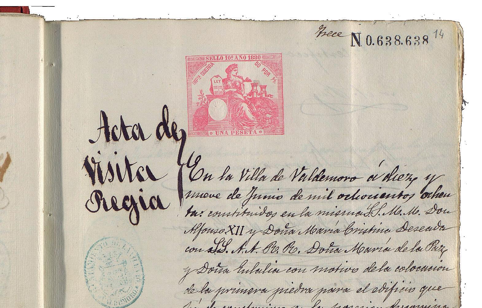 En el Archivo Municipal se custodia un interesante documento que lleva por título ‘Acta de visita regia’ (19 de junio de 1880) y describe la visita del monarca Alfonso XII junto a la reina, las infantas y otras personalidades del Gobierno para “la colocación de la primera piedra para el edificio que ha de construirse en la denominada finca El Juncarejo”, actual colegio Marqués de Vallejo.
