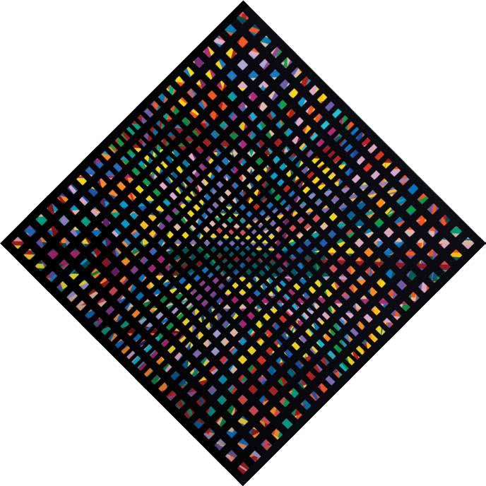 Murad’s investigation of interlocking shapes and contrasting hues continued with paintings that limit the viewer’s perception of depth to a single surface, and emphasise colour in order to ‘transmit’ energy and emotion to the viewer. In The Magical Carpet (2008), tightly assembled forms make it difficult to discern between positive and negative space, an elimination of the boundary between foreground and background that results from the artist’s use of evenly distributed solid colour and hardedge lines. The work is mostly composed of rotated polygons. This uniform image recreates the sensation of watching an object in motion, as the shapes appear to turn clockwise. Here, Murad is ‘feeling through colour— and not with structure’ as Michael Fried observed in the colour field paintings of Kenneth Noland. According to Fried, this led the Washington Colour School artist to ‘discover structures in which the shape of the support [or the stretcher] is acknowledged lucidly and explicitly enough to compel conviction.’7 Murad’s investigation of colour relativity—what Josef Albers defined as ‘the mutual influencing of colours,’—quickly progressed to a consideration of the physical nature of the painting, as an independent object.