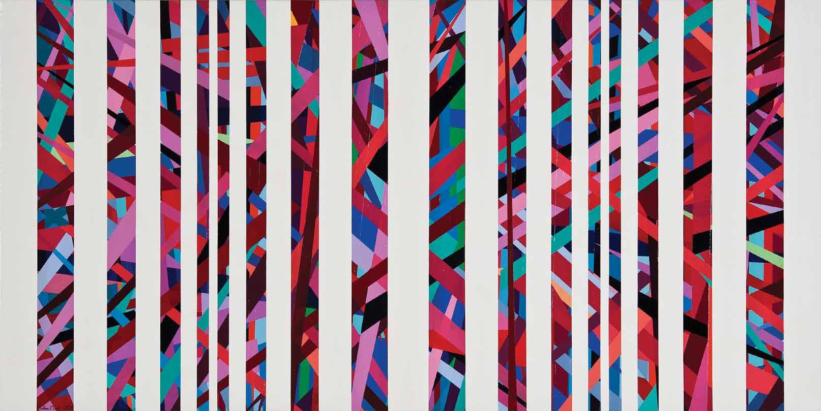 Works such as Oriental Colours (2009) verify Murad’s reliance on form to retrieve mental images. With an intricate lattice that travels across the composition, the triptych offers a resplendent expanse that reproduces the sensation of traversing different terrains. Sea blue squares, coral and lavender rectangles, and emerald and mustard stripes intersect throughout the painting in a labyrinth of hues. The title of the work describes things that reside in memory but are unnamed, points of reference drawn from Murad’s experiential knowledge reimagined with colour. The crisscrossing shapes and lines of his sectioned canvases offer endless passageways for the viewer. >>