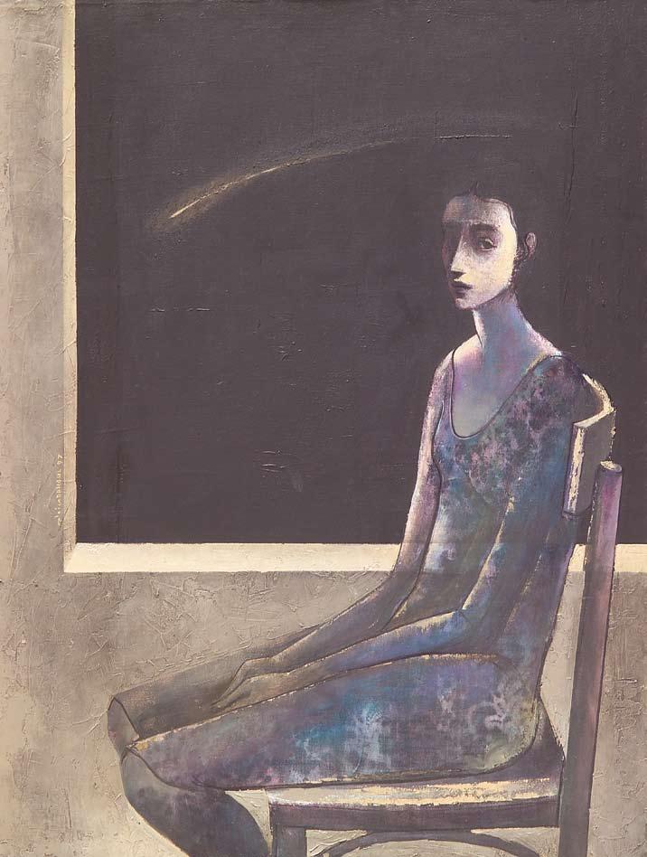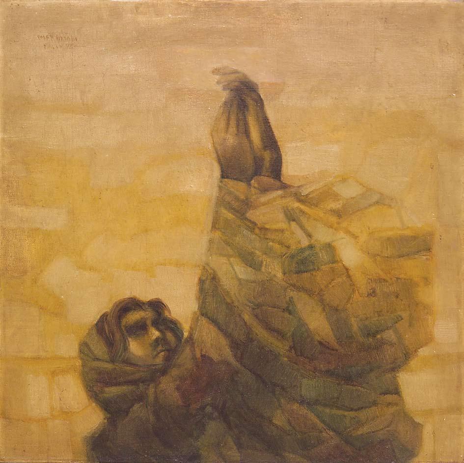 Set against an empty background that appears turbulent and vast, Hamdi’s female figure is shown as though overcome by an insufferable grief. The rendering of his subject amidst such an extreme state of emotional collapse is characteristic of the themes of despair and trepidation that surfaced in local painting of the time. Expressionist markings in the foreground of the composition seem to engulf her fragile form, as this tumultuous movement of brushwork is also used to execute her hair and clothing. She is so consumed by this metaphorical storm that she appears to be drifting off into unconsciousness, as hope vanishes into oblivion.