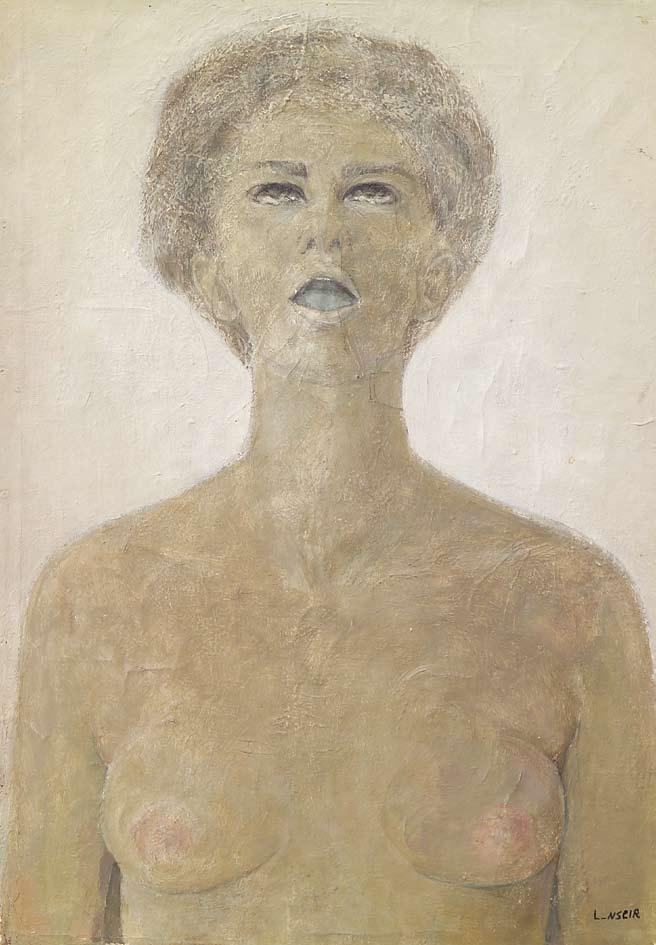 In “Portrait,” Nsier communicates this sense of torment without visually specifying the context or cause of her subject’s angst, leaving the narrative behind it open ended. A nude woman is shown from her torso up, as she stands directly before the viewer. With a disrobed body she remains vulnerable, as nothing shields her from their gaze. Her head is raised as she stares at an unknown presence that lies beyond the composition. With her mouth opened as though calling out, it is suggested that she is in a moment of need or want, desiring something that lies outside of her grasp. She stands before a soft white background that is appears solid flat in comparison to Nseir’s painterly execution of her body, which exhibits variations in tone and the use of highlights. And yet her figure is sickly, her face devoid of warmth.