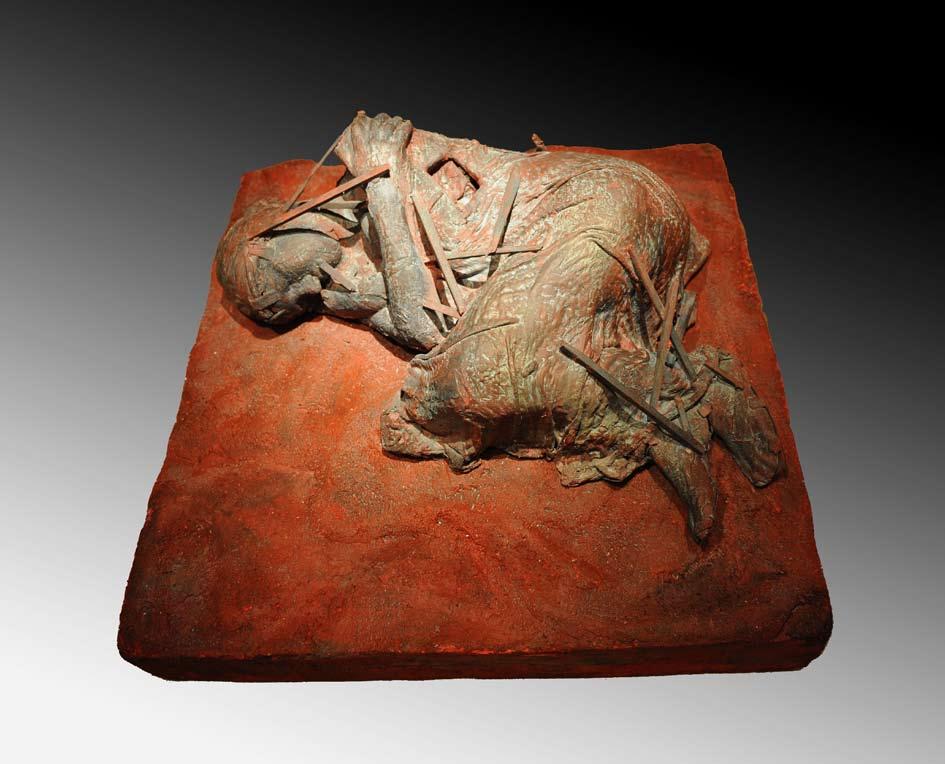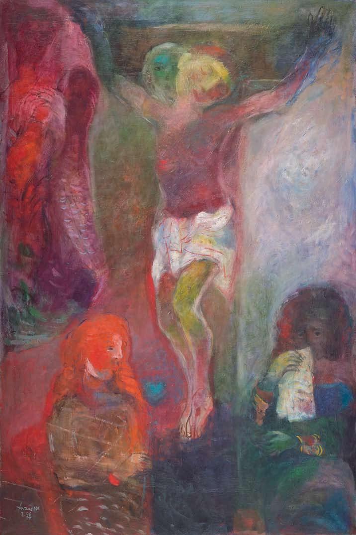 Using Christian iconography to describe the 1996 bombing of a UN shelter in southern Lebanon by Israeli forces, Edward Shahda evokes the killing of over one hundred civilians without showing them amidst their final moments. Following in the footsteps of Arab modernists, he employs allegorical representations when depicting the abject. Torment and death are thus conveyed in “Qana” (1996) through the suffering of Christ as he is crucified before his followers.
