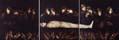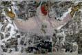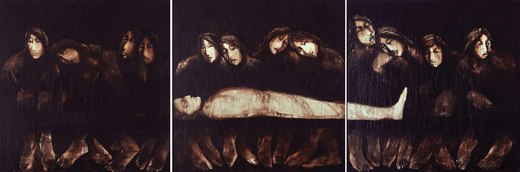 Ismael’s martyred subjects lie in the foreground of the composition, as the explicit details of their murders are laid out before the viewer. A small hand pours an unknown liquid into the wounds of the dying woman, her body responding by seeming to rise, as the artist suggests the resurrection of one of the last remaining survivors. In the meantime, the three perpetrators of this massacre stand looking wickedly at the viewer, their weapons aimed for further onslaught, although the gunman on the far left seems unsure.
