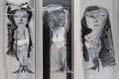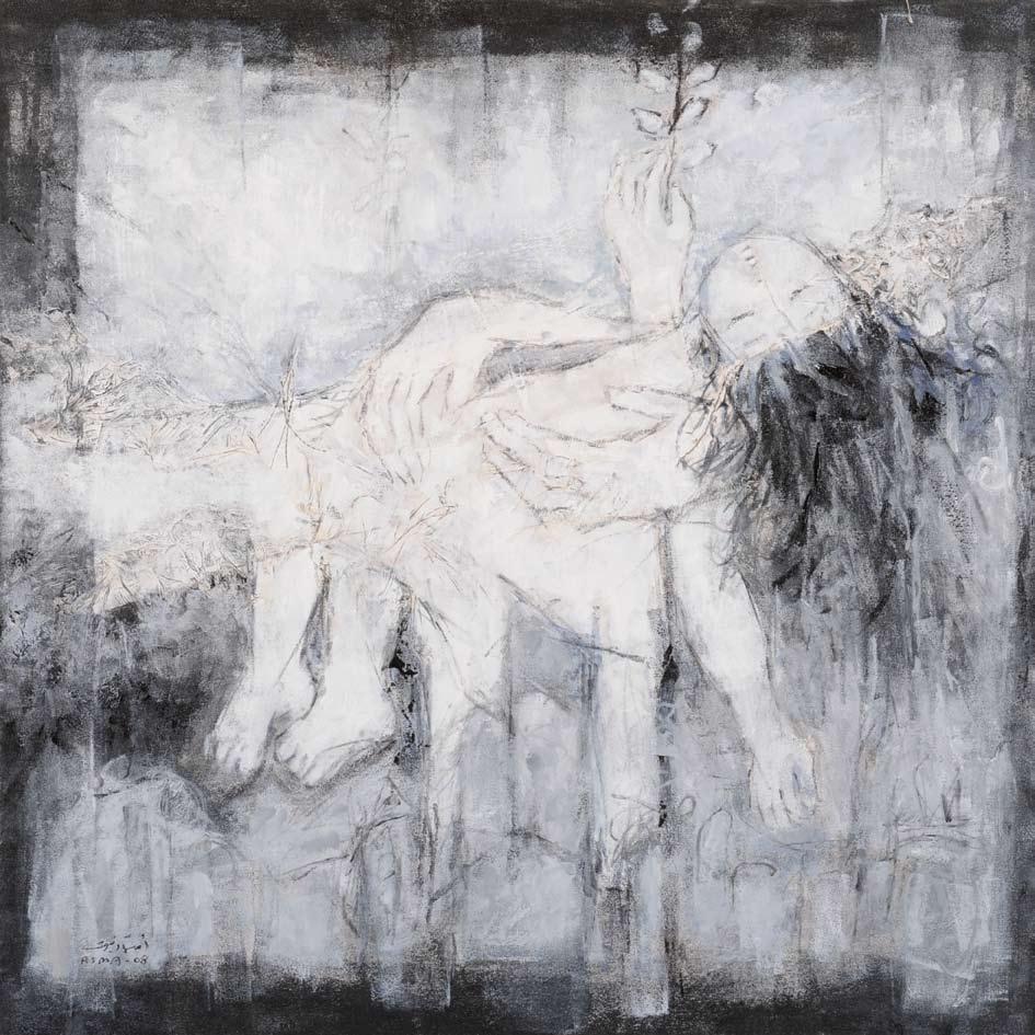 The recent monochromatic paintings of Rima Salamoun are deeply psychological, as dark figures are cramped into shallow spaces and their penetrating gazes awake one’s consciousness. Her acrylic and mixed media canvases are dramatically stark, as sorrow-filled subjects console each other amidst a dim world. Frequently featuring female protagonists, her works belong to a profound strand of Syrian art that has utilized women as powerful representations of the plight of humanity. Maintaining the anonymity of her subjects, she creates universal narratives from which viewers can grasp the weight of global concerns. She does so with an accomplished command of medium and an apparent talent for drawing. Born in Damascus, Syria in 1963, Salamoun graduated from the Faculty of Fine Arts at Damascus University in 1987. A member of the Syrian Syndicate of Fine Arts, she has participated in several collective exhibitions in the Arab world and Europe such as the acclaimed “Syrian Contemporary Art” at the Waqif Art Center in Qatar and has held a number of solo shows at home and abroad, most notably at Gallery Espace Europia in France. In March 2010 she was featured in “Syrian Fine Art Painters” a group exhibition held at the UNESCO Palace in Beirut as part of the city’s “World Book Capital” proceedings, where her work was received with an overwhelming response from Lebanese viewers and international art lovers.