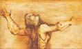 Huddled closely, his mask-like figures appear twisted in piercing terror as they seek refuge from an imminent doom. With warm browns, deep blues and billowing white, the palette that Sibai used to render the couple insinuates a connection to earth and sky, an aspect that is accentuated as they are engulfed by their surroundings. A dark area of grey looms in the upper left hand corner of the composition, while a stark light shines onto their outlines from an unseen source.