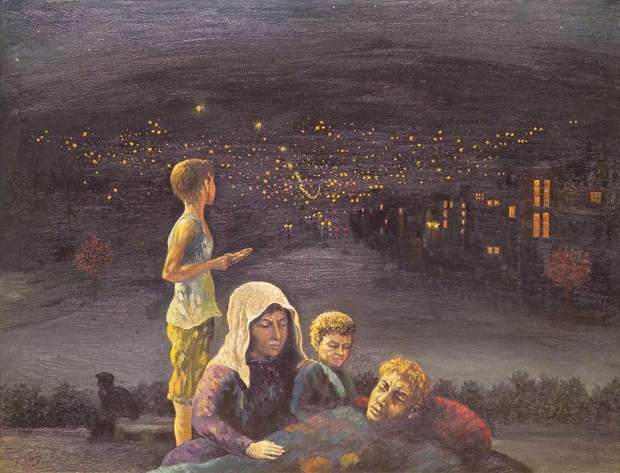 In the lower part of the composition sits a woman who is consoling a debilitated man, perhaps her husband or son. As she kneels down to tend to him she also holds a small child, who appears distraught. An adolescent boy stands behind them, staring off into the distant image of a village that is depicted in twilight. As clouds hover and stars veil its streets, it is inferred that the village is actually the vision of the family’s former home. The boulevard of the town leads towards the foreground into yet another apparition, one of wide-open land that they have also left behind. All that remains of their former lives are the few belongings with which they travel, their destination unknown.