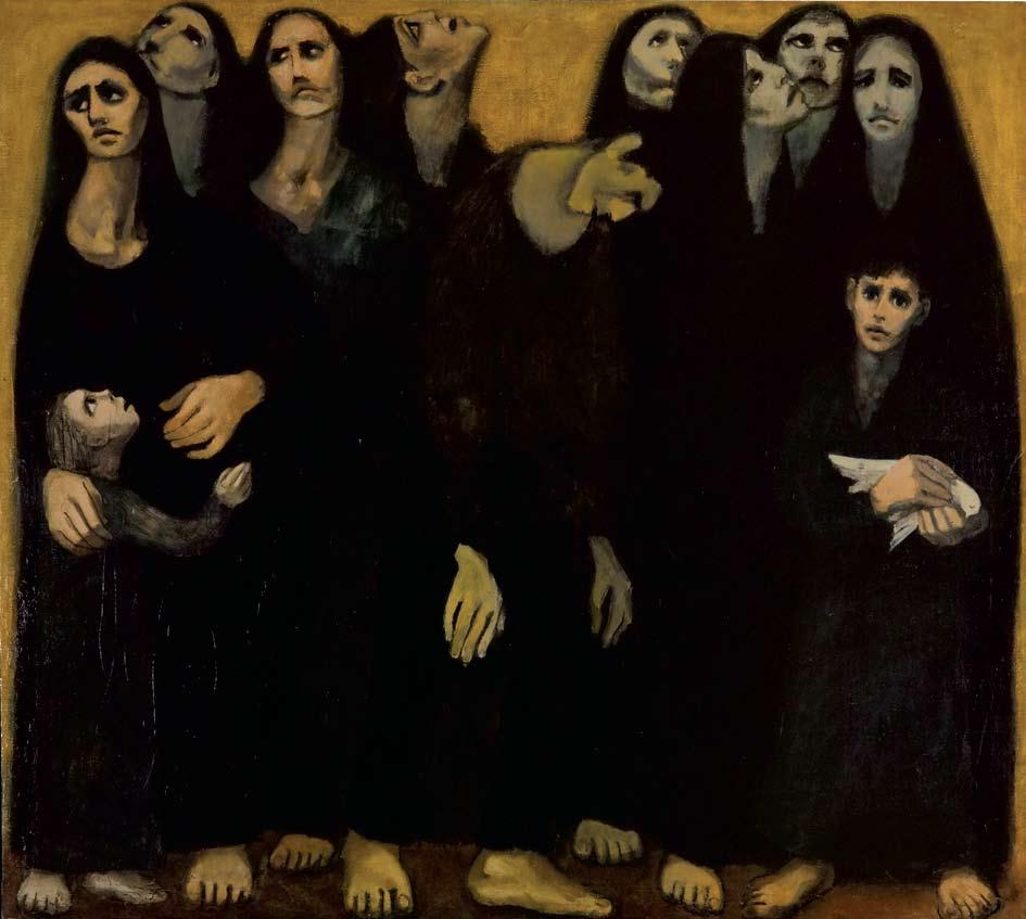 Executed early on in his career, “Then What?” stands out from the rest of his oeuvre with its loose rendering of forms, an approach that gives the image of his gathered subjects a ghostly semblance. Do they appear as a mirage before the viewer or are they merely visions of the future? That his composition provides no visual clues as to the identity or nationality of his subjects, and makes no reference in place or time, gives birth to its initial sense of forecasting. His displaced figures could be Armenian or Vietnamese or any other of the countless populations that were made refugees by violent assaults in the twentieth-century. Today “Then What?” still resonates as residents of Iraq, Afghanistan, Pakistan and Sudan escape conflicts at home and more Palestinians are shutout from their land by Israeli policies and offensives.