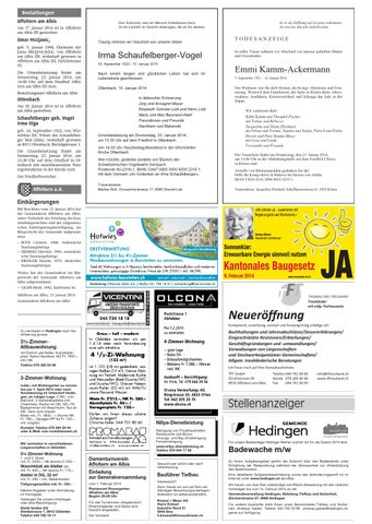 Schaufelberger geb. Vogel Irma Olga geb. 24. September 1922, von Winterthur ZH, Witwe des Schaufelberger Max Julius, wohnhaft gewesen in 8913 Ottenbach, Rüchligstrasse 1. Die Urnenbeisetzung findet am Donnerstag, 23. Januar 2014, um 13.30 Uhr auf dem Friedhof in Ottenbach mit anschliessendem Trauergottesdienst in der Kirche statt. Der Friedhofvorsteher