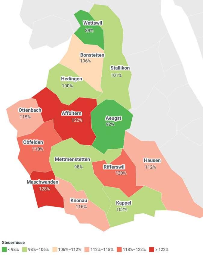 und angesichts wachsender Kosten und Investitionen eine Steuerfusserhöhung in absehbarer Zeit zu prüfen sein wird. Von Steuersenkungen profitieren konnten neben Wettswil auch die Gemeinden Bonstetten (minus 3), Stallikon und Rifferswil (je minus 2) sowie Obfelden und Maschwanden mit je einem Prozentpunkt.