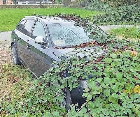 Dieses schnittige Modell findet man halt nicht so schnell, denn es steht hier – wie zum Tanken unter diesen Brombeerranken.