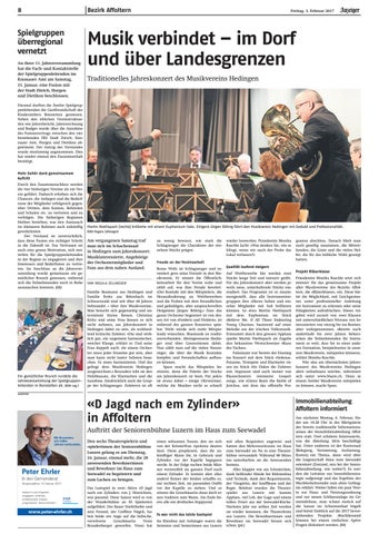 Immobilienabteilung Affoltern informiert Am nächsten Montag, 6. Februar, findet um 19.30 Uhr in der Märtgalerie der bereits traditionelle Informationsanlass der Immobilienabteilung Affoltern statt. Dort erfahren Interessierte, was die Abteilung 2016 beschäftigt hat. Unter anderem ist der Kasinosaal (Belegung, Vermietung, Auslastung, Kosten) ein Thema, dann wird über die Liegenschaft Haus zum Seewadel orientiert (Zustand, neu bei der Immobilienabteilung, wie weiter?). Es werden die Leitsätze zur Immobilienstrategie aufgezeigt und das Ergebnis der Machbarkeitsstudie zum alten Gefängnis erklärt. Weiter fallen ein paar Worte zur Haus- und Nutzungsordnung und zur neuen Schliessanlage im Gemeindehaus, man schaut zurück auf die Saison im Schwimmbad Stigeli und bietet Einblick auf die 2017 bevorstehenden Projekte. Abschliessend können bei einem einfachen Apéro Fragen diskutiert werden. (hb)
