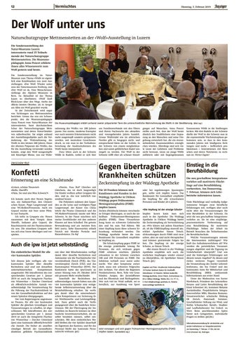 Der Wolf unter uns Naturschutzgruppe Mettmenstetten an der «Wolf»-Ausstellung in Luzern Die Sonderausstellung des Natur-Museums Luzern interessierte rund 35 Teilnehmende der Naturschutzgruppe Mettmenstetten. Die Museumspädagogin Anna Poncet erklärte ihnen alles Wissenswerte zum Wolf gestern und heute. Die Sonderausstellung im NaturMuseum zum Thema «Wolf» ist eigentlich eine Kombination von zwei Ausstellungen: «Der Wolf. Wieder unter uns» des Naturmuseums Freiburg, und «Der Wolf ist da. Eine Menschenausstellung» des Alpinen Museums in Bern. An Aktualität ist das Thema kaum zu überbieten: «Wolf läuft Blick-Leser über den Weg», titelte der «Blick» letzten Oktober, als in Aeugst am Albis ein Wolf gesichtet wurde. In der Zwischenzeit wird sogar von Sichtungen aus Mettmenstetten berichtet. Genau das war ein Schwerpunkt, den die Museumspädagogin Anna Poncet vom Natur-Museum der interessierten, bunt durchmischten Schar der Naturschutzgruppe Mettmenstetten und deren Natur-Detektiven näherbrachte. Sie zeigte anhand der Ausstellungsobjekte auch die Veränderung der Wahrnehmung des Wolfs in den letzten 200 Jahren. Eines der ältesten Präparate des Wolfes, das für die Ausstellung verwendet werden konnte, zeigt den Wolf «ausgestopft» mit bösartiger Miene, was zur Wahr-