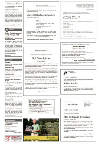 Wir sprechen der Familie und den Angehörigen unser herzlichstes Beileid aus. Gesangverein Hedingen Die Trauerfeier findet am Freitag, 8. Februar 2019, um 14.00 Uhr in der Kirche in Hedingen statt.