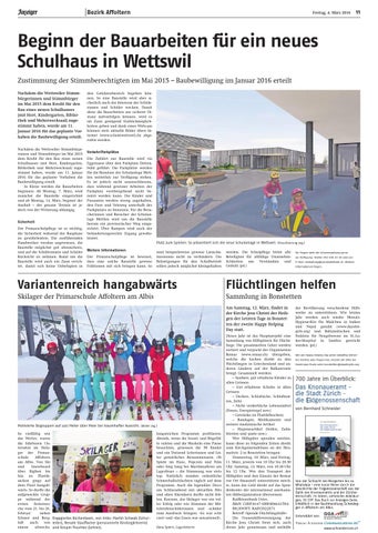 Beginn der Bauarbeiten für ein neues Schulhaus in Wettswil Zustimmung der Stimmberechtigten im Mai 2015 – Baubewilligung im Januar 2016 erteilt Nachdem die Wettswiler Stimmbürgerinnen und Stimmbürger im Mai 2015 dem Kredit für den Bau eines neuen Schulhauses (mit Hort, Kindergarten, Bibliothek und Mehrzwecksaal) zugestimmt haben, wurde am 11. Januar 2016 für das geplante Vorhaben die Baubewilligung erteilt. Nachdem die Wettswiler Stimmbürgerinnen und Stimmbürger im Mai 2015 dem Kredit für den Bau eines neuen Schulhauses (mit Hort, Kindergarten, Bibliothek und Mehrzwecksaal) zugestimmt haben, wurde am 11. Januar 2016 für das geplante Vorhaben die Baubewilligung erteilt. In Kürze werden die Bauarbeiten beginnen: Ab Montag, 7. März, wird zunächst die Baustelle eingerichtet und ab Montag, 14. März, beginnt der Aushub – der genaue Termin ist jedoch von der Witterung abhängig.