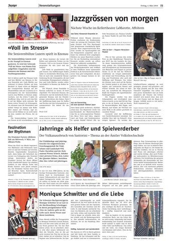 Schauspielhäusern engagiert. Für ihr aktuelles Buch hat sie 2015 den Schweizer Buchpreis gewonnen, die Jury würdigte das Buch als «facettenreiche Darstellung einer Liebesbiografie – kräftig, humorvoll und nachdenklich.» «Eins im Andern» ist ein aussergewöhnliches Buch: wie das Leben heiter und traurig, tiefgründig und banal, bodenständig und verspielt. Scheinbar leicht kommt es daher und ist doch voller Tiefe und Raffinesse. Das Leben und die Liebe, ein ewiger Kreislauf von Kommen und Gehen, «Eins im Andern» eben. (pd.) Freitag, 11. März, 19.30 Uhr, Buchhandlung Scheidegger. Eintritt 25 Franken, mit Apéro.