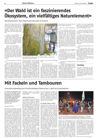 Waldhütte, hat einen Stamm-Durchmesser von rund eineinhalb Metern und ist gegen 250 Jahre alt. Sie hat schon die Zeit Napoleons erlebt. Sie wohnen in Birmensdorf. Werden Sie auch nach der Pensionierung ab und zu in den Wäldern im Bezirk Affoltern anzutreffen sein? Ja sicher. Dieser schönen Landschaft mit ihren Wäldern werde ich treu bleiben. Man wird mich als Spaziergänger antreffen, als einen mit offenen Augen. Ich werde natürlich die «Miss» ab und zu besuchen und ich freue mich, wenn ich auch Bekannte wiedersehe. Worauf freuen Sie sich nach der Pensionierung? Auf mehr zeitliche Freiheit, wo auch persönliche Interessen mehr Platz haben, die ich zum Teil zurückstellen musste. Ich denke dabei an die Pflege von Beziehungen, ans Lesen, an meinen Garten oder auch daran, noch eine Sprache zu lernen. Wir danken Ihnen für Ihren Einsatz in unserm Bezirk und wünschen Ihnen alles Gute für die Zukunft. Interview: Marianne Voss
