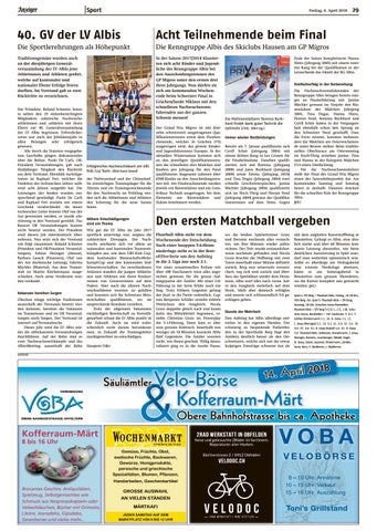 mit dem aalglatten Kunststoffbelag in Bonstetten. Gelingt es Albis, eine ähnlich starke und über 60 Minuten konstante Leistung abzurufen, wie beim deutlichen Auswärtssieg in Spiel zwei, darf man weiterhin optimistisch sein. Sollte es allerdings am Freitagabend eine erneute Niederlage absetzen, käme es am Sonntagabend in Bonstetten zum grossen Showdown, wo die Karten komplett neu gemischt würden. (pd.) Spiel 4: STV Berg – Floorball Albis, Freitag, 20.30 Uhr, MZH Berg. Evl. Spiel 5: Floorball Albis – STV Berg, Sonntag, 18 Uhr, Schachen Arena Bonstetten Floorball Albis – STV Berg 5:6 (2:1, 1:5, 2:0). Scha-